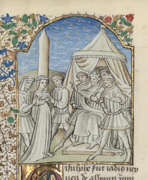 Parigi, Bibliothèque interuniversitaire Sainte-Geneviève, 1128, f. 320v. Il capo degli Avari ordina di impalare Romunda.