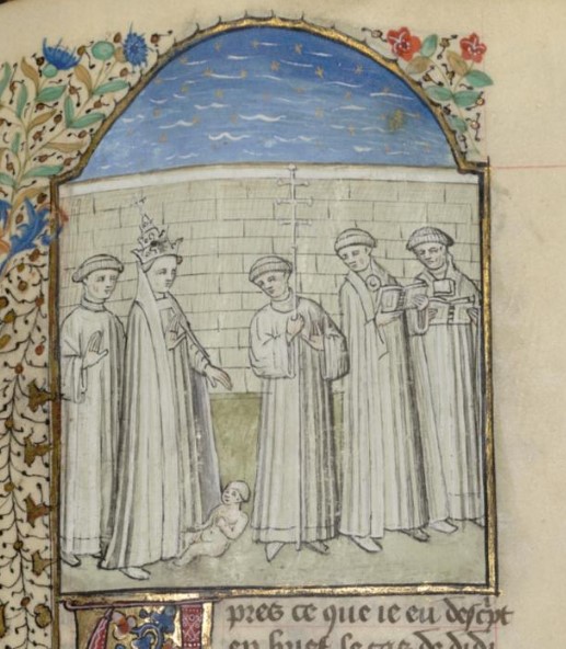 Parigi, Bibliothèque interuniversitaire Sainte-Geneviève, 1128, f. 325r. La papessa Giovanna dà alla luce un bambino durante una processione religiosa.