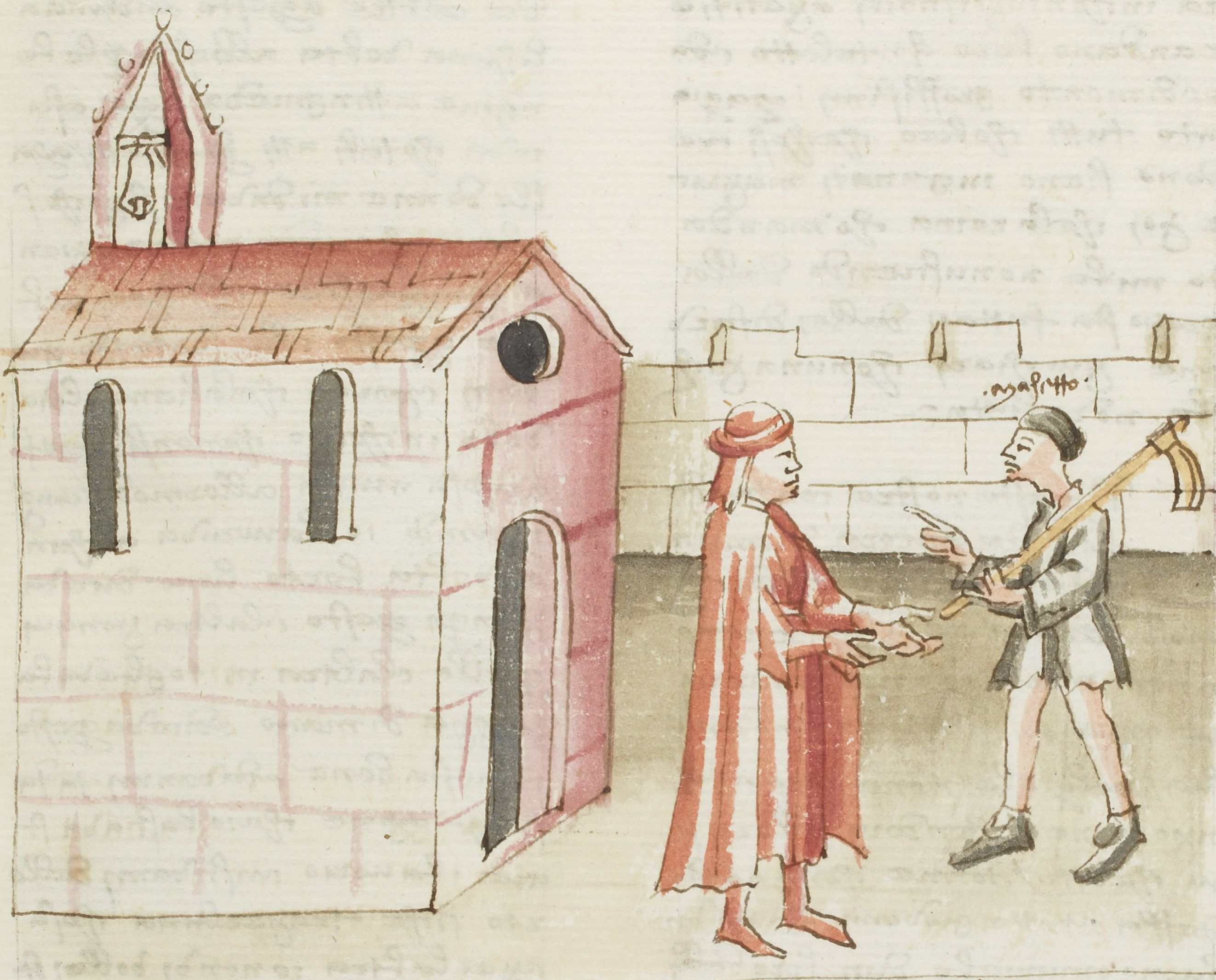 Parigi, Bibliothèque Nationale de France, It. 63, f. 91r. Il copista del manoscritto, datato 10 ottobre 1427, è Ludovico di Salvestro Ceffini. Masetto, fingendosi sordomuto, chiede al castaldo il permesso di entrare nel convento delle monache.