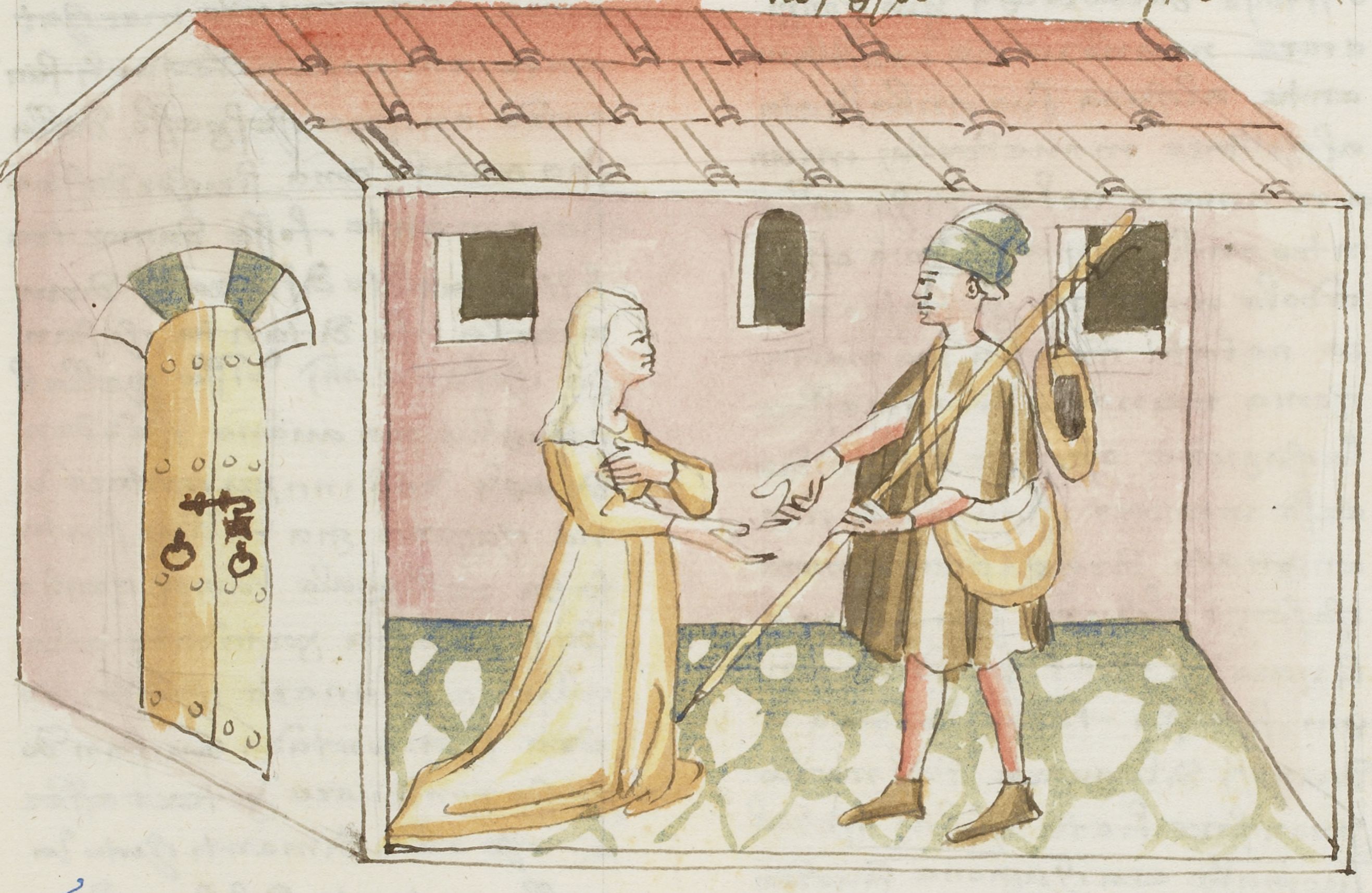 Parigi, Bibliothèque Nationale de France, It. 63, f. 110r. Il copista del manoscritto, datato 10 ottobre 1427, è Ludovico di Salvestro Ceffini. Tedaldo, vestito da pellegrino, conversa in casa con monna Ermellina.