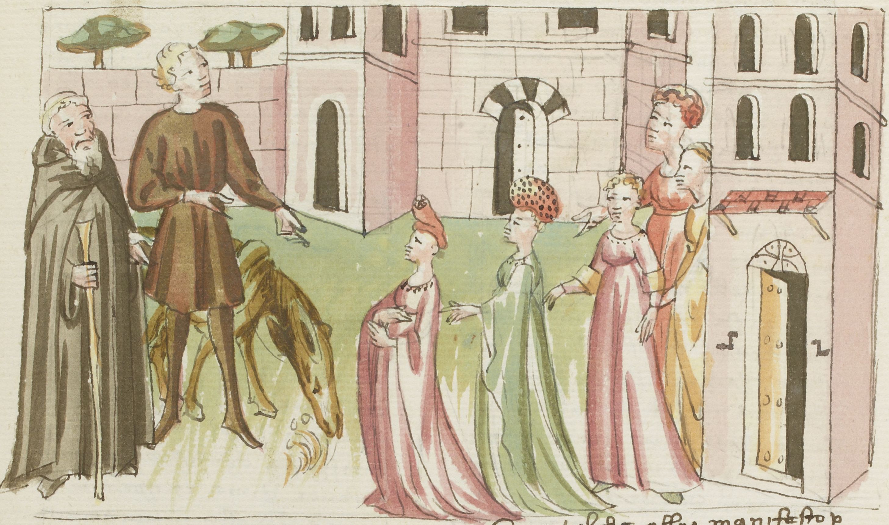 Parigi, Bibliothèque Nationale de France, It. 63, f. 130r. Il copista del manoscritto, datato 10 ottobre 1427, è Ludovico di Salvestro Ceffini. Filippo Balducci e suo figlio, rientrati a Firenze, incontrano un gruppo di giovani donne.