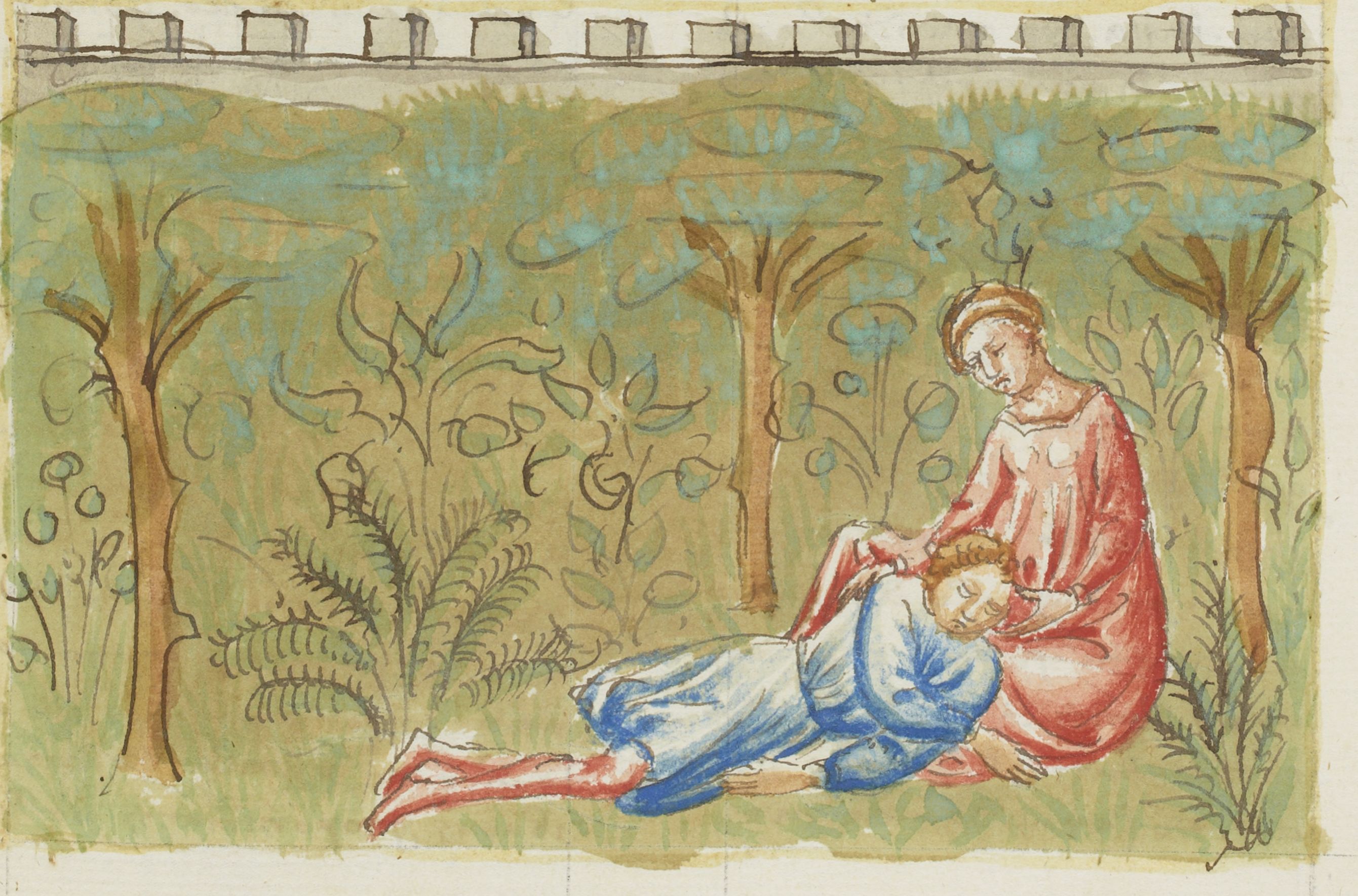 Parigi, Bibliothèque Nationale de France, It. 63, f. 150r. Il copista del manoscritto, datato 10 ottobre 1427, è Ludovico di Salvestro Ceffini. Nel giardino Gabriotto muore tra le braccia di Andreuola.