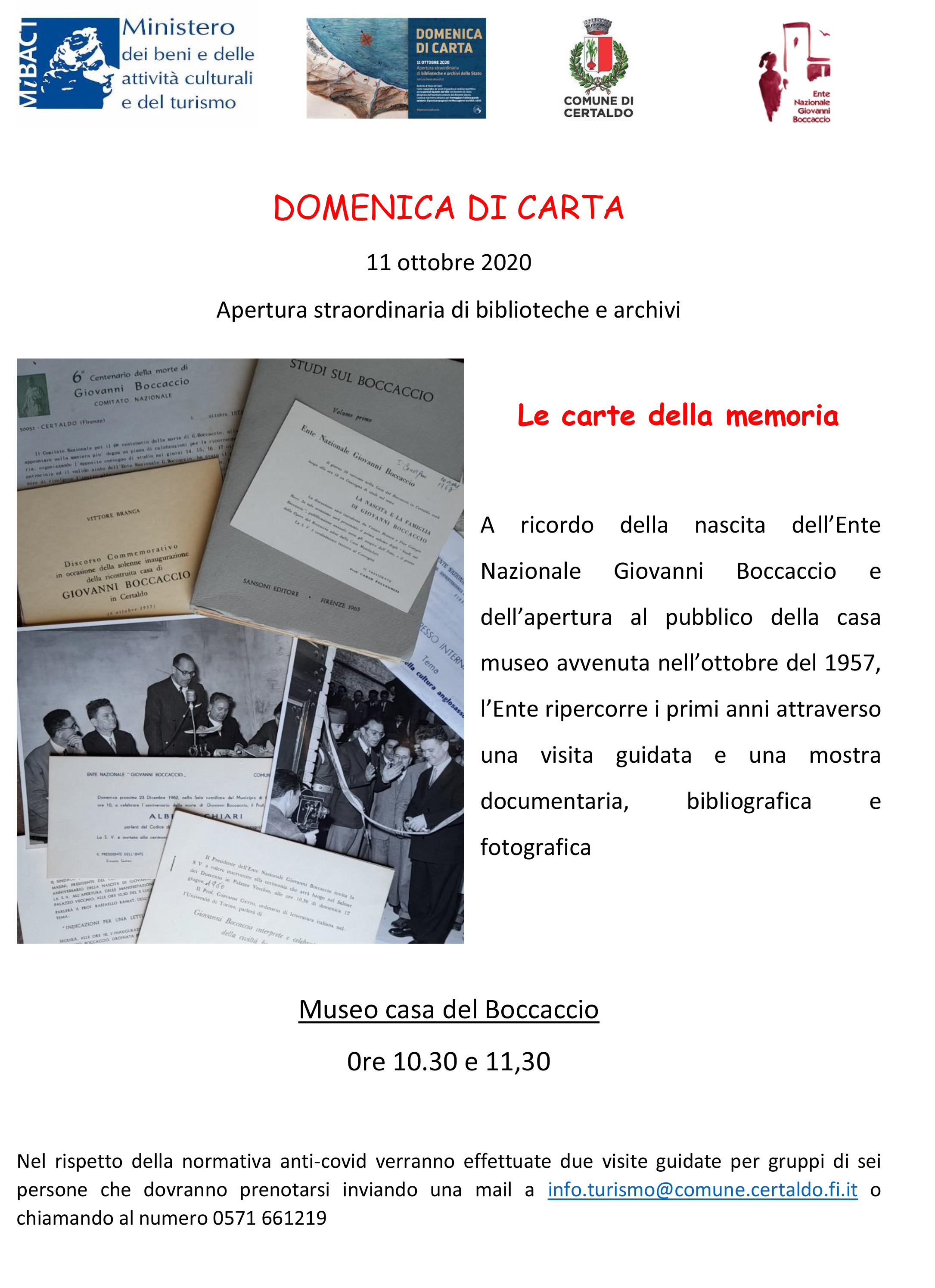 Nel rispetto della normativa anti-covid verranno effettuate due visite guidate, alle ore 10.30 e alle ore 11.30, per gruppi di sei persone che dovranno prenotarsi inviando una mail a info.turismo@comune.certaldo.fi.it o chiamando al numero 0571 661219.