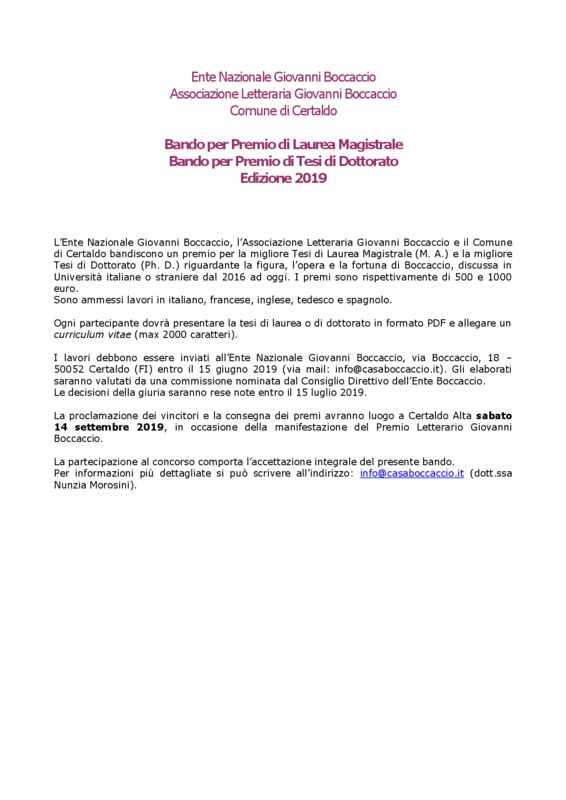 L’Ente Nazionale Giovanni Boccaccio, l’Associazione Letteraria Giovanni Boccaccio e il Comune di Certaldo bandiscono un premio per la migliore Tesi di Laurea Magistrale (M. A.) e l…