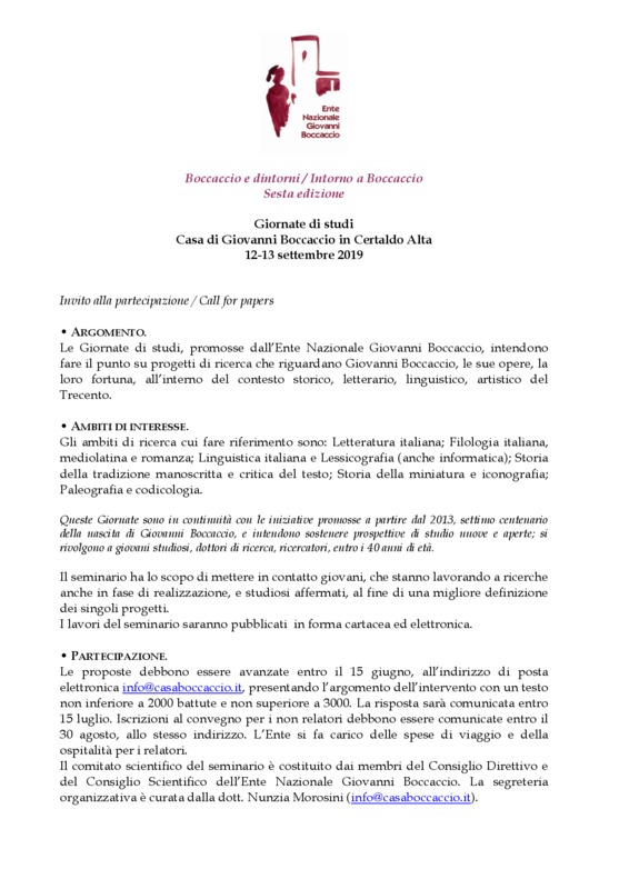 Call for Papers per Giornate di studi Casa di Giovanni Boccaccio in Certaldo Alta