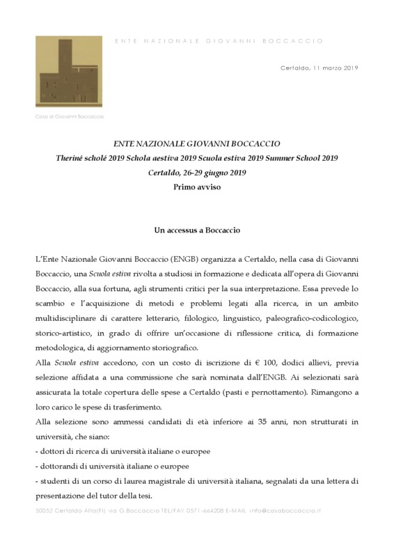 Primo avviso per Summer School 2019: Un accessus a Boccaccio