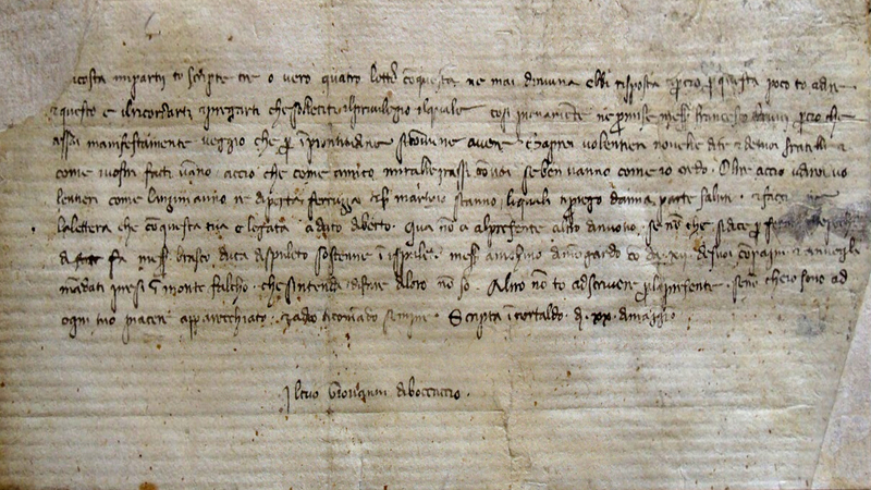 Cart., mm. 90 × 225. Lettera (con sottoscrizione autografa) inviata a Leonardo Del Chiaro da Certaldo il 20 maggio 1366.