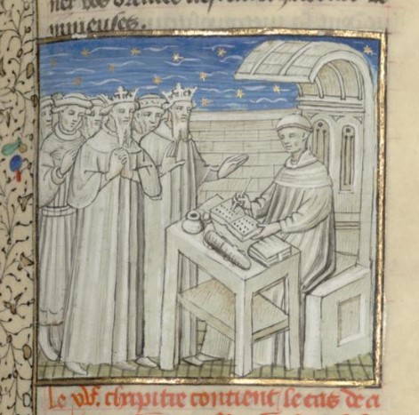 Parigi, Bibliothèque interuniversitaire Sainte-Geneviève, 1128, f. 47r. Giovanni Boccaccio incontra tre re bramosi di ricchezze.