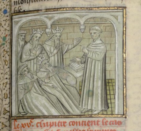 Parigi, Bibliothèque interuniversitaire Sainte-Geneviève, 1128, f. 44v. Giovanni Boccaccio incontra tre sovrani.