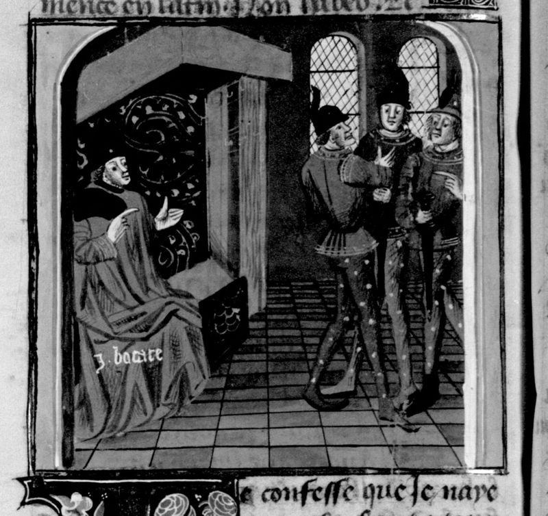 Parigi, Bibliothèque Nationale de France, Fr. 230, f. 208r. Il copista del manoscritto è P. Droulin. Giovanni Boccaccio incontra alcuni Ebrei.