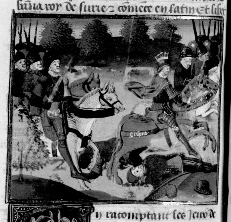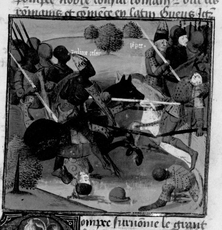 Parigi, Bibliothèque Nationale de France, Fr. 230, f. 170r. Il copista del manoscritto è P. Droulin. Giulio Cesare sconfigge Pompeo nella battaglia di Farsalo.