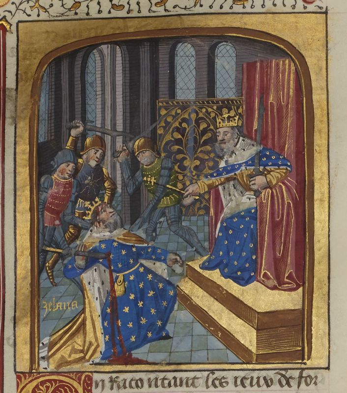 Parigi, Bibliothèque Nationale de France, Fr. 234, f. 64v. Re Gripo, seduto sul trono, ordina a tre soldati di assassinare Alessandro Zebenna.