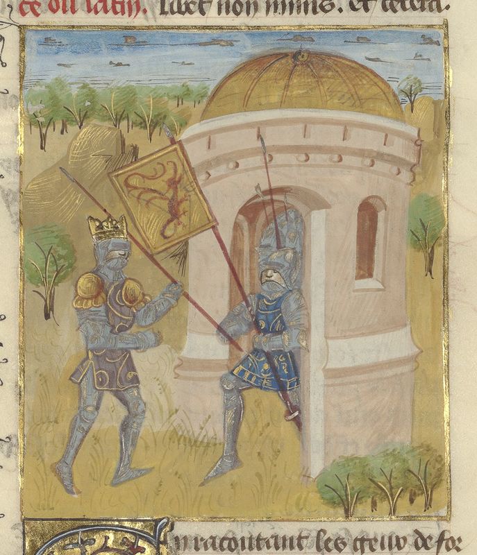 Parigi, Bibliothèque de l'Arsenal, 5192, f. 194r. Le mogli dei Cimbri in armatura affrontano l'esercito romano.