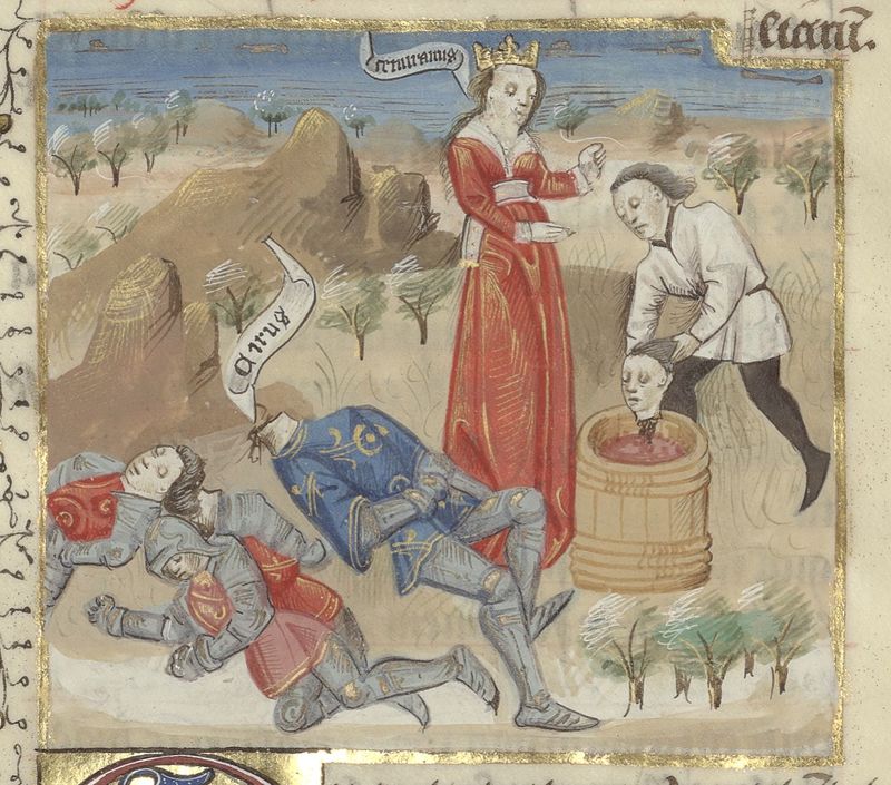 Parigi, Bibliothèque de l'Arsenal, 5192, f. 66v. La regina Tamiri ordina di porre la testa di Ciro in una botte piena del sangue dei suoi cavalieri.