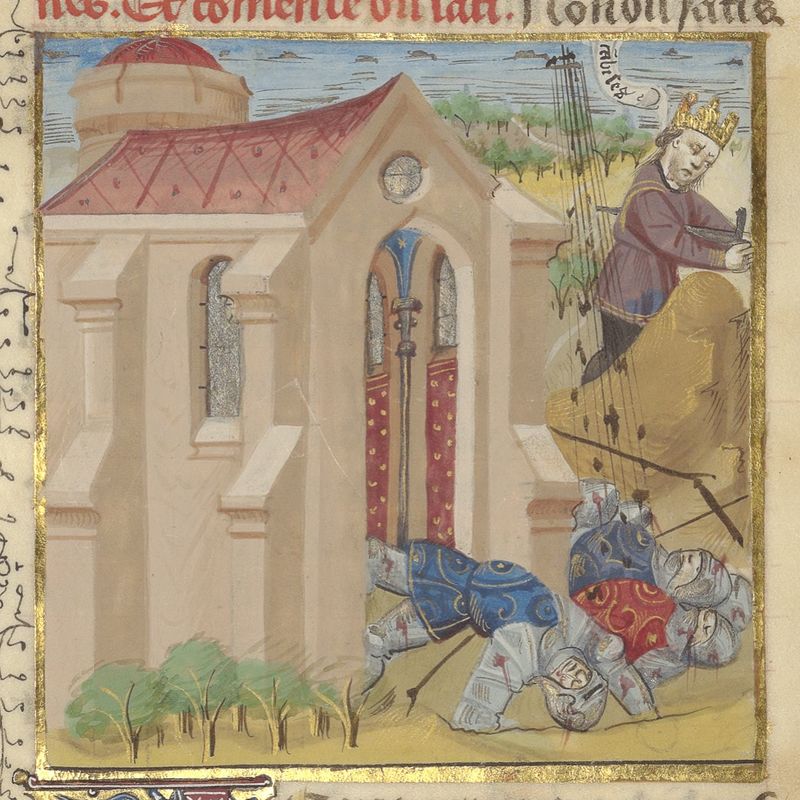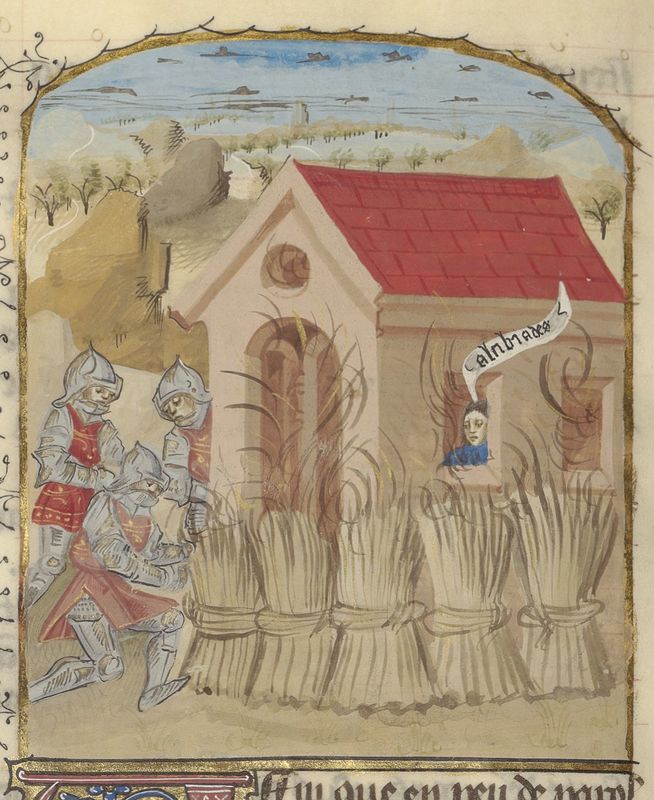 Parigi, Bibliothèque de l'Arsenal, 5192, f. 84v. Gli uomini di Cambise colpiti da una tempesta; Cambise si getta sulla sua spada.