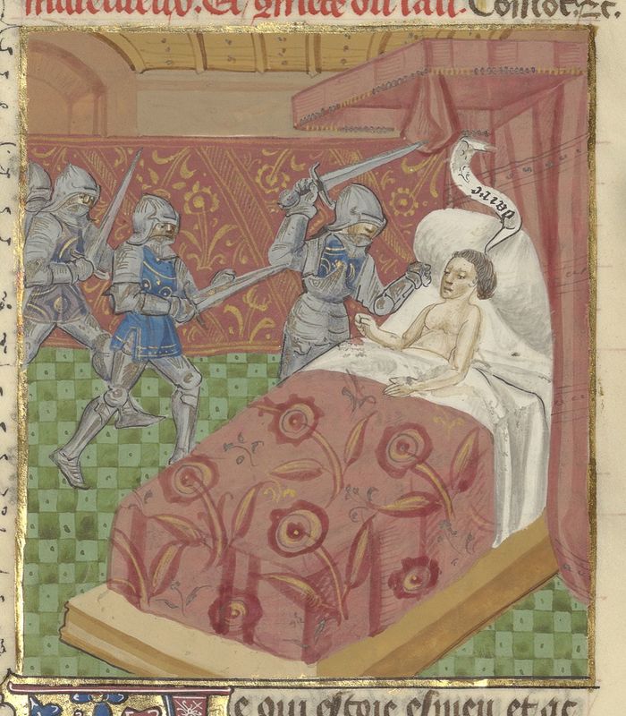 Parigi, Bibliothèque de l'Arsenal, 5192, f. 92v. Artabano uccide Serse colpendolo mentre giace a letto.