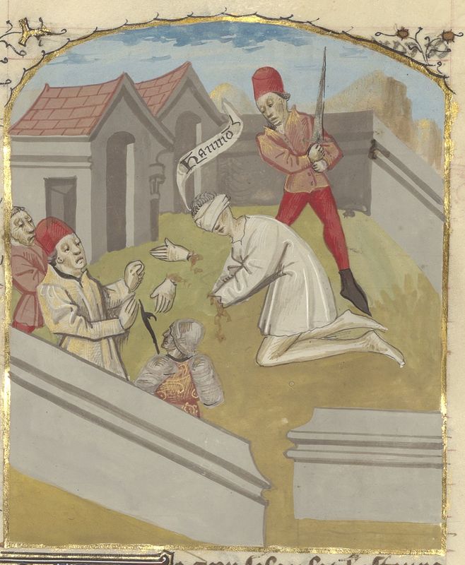 Parigi, Bibliothèque de l'Arsenal, 5192, f. 106r. Annone, con le mani mozzate, viene giustiziato dinanzi alla folla.
