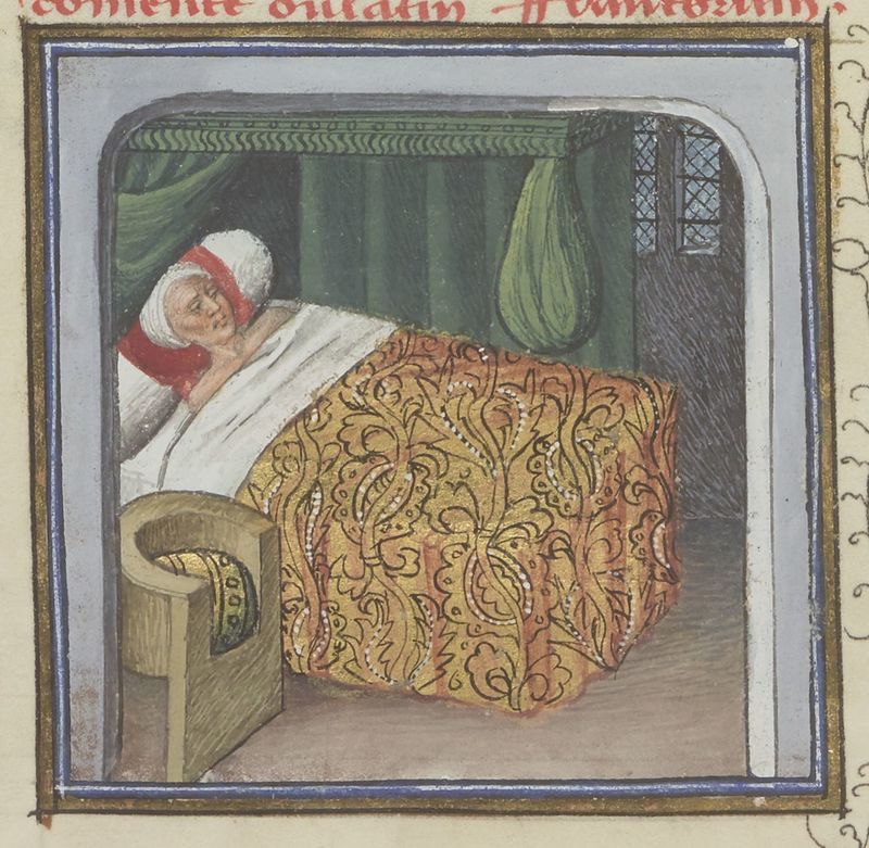 Parigi, Bibliothèque Nationale de France, Fr. 229, f. 379v. Il copista del manoscritto è Boniface de Remenant. Carlo d'Angiò, re di Sicilia, sul letto di morte.