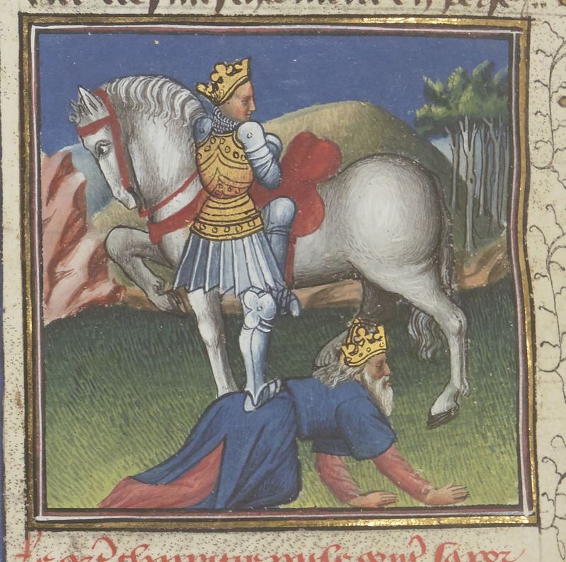 Parigi, Bibliothèque Nationale de France, Fr. 229, f. 311v. Il copista del manoscritto è Boniface de Remenant. Re Sapore monta a cavallo usando la schiena di Valeriano come predell…