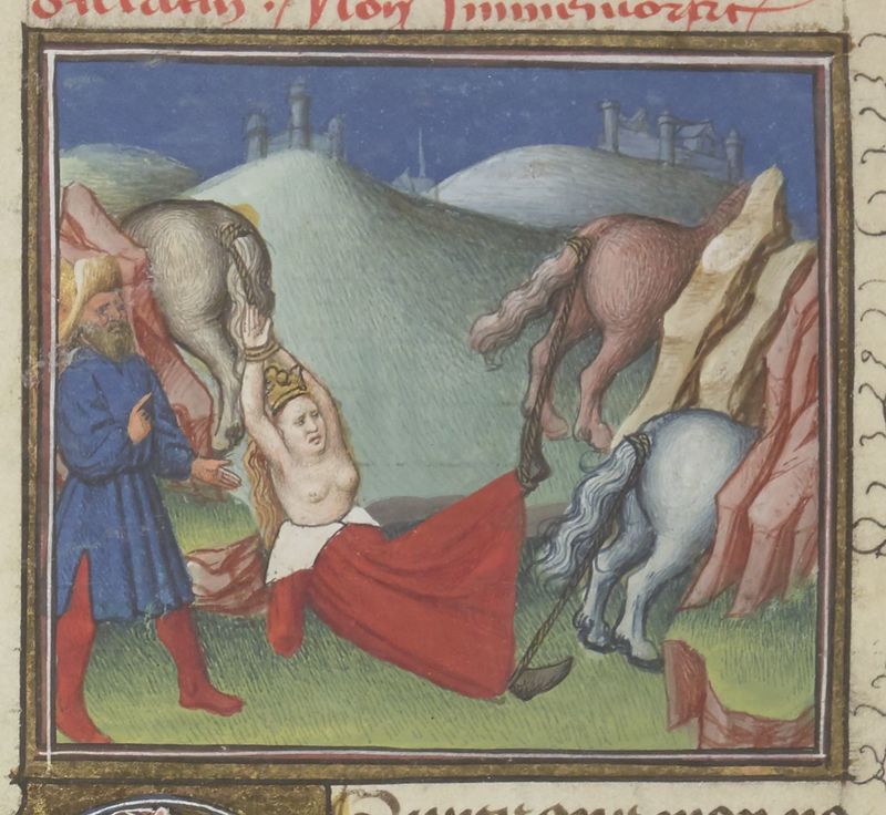 Maestro del Roman de la Rose di Vienna (1435-1440), Brunichilde viene squartata dai cavalli