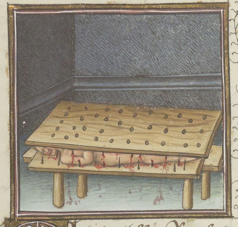 Parigi, Bibliothèque Nationale de France, Fr. 229, f. 183v. Il copista del manoscritto è Boniface de Remenant. Attilio Regolo viene torturato tra due assi chiodate.