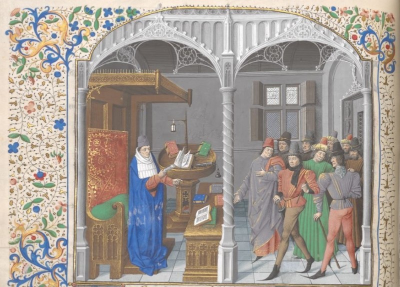 Londra, British Library, Add. 35321, f. 107v. L'autore Giovanni Boccaccio, in piedi accanto ad un leggio e una scrivania, indica una folla di derelitti all'altro capo della stanza.