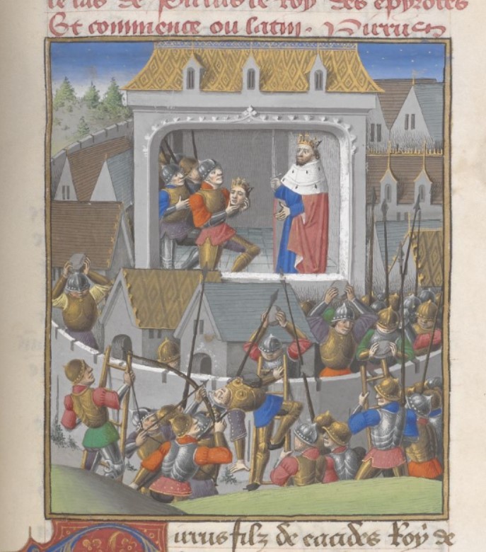 Londra, British Library, Add. 35321, f. 166v. Re Nicomede ordina l'esecuzione del padre Prusia.