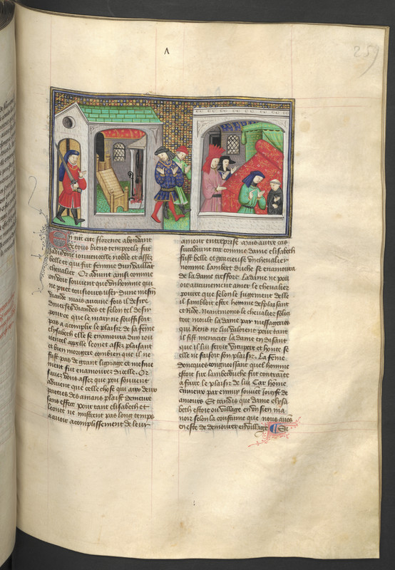 Miniatore francese (1425-1450), Monna Piccarda visita il parroco di Fiesole; il parroco viene sorpreso dal vescovo a letto con la serva