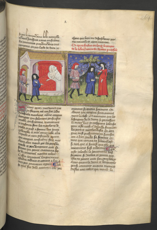 Vienna, Österreichische Nationalbibliothek, 2561, f. 264r. Arriguccio insegue Ruberto fuori la camera da letto dove dorme la moglie; la moglie di Arriguccio accusa il marito davant…