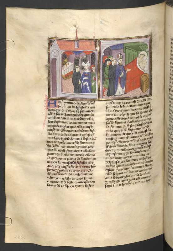Vienna, Österreichische Nationalbibliothek, 2561, f. 277r. Il banchiere Guasparruolo presta 200 fiorini a Gulfardo; Gulfardo consegna il denaro ad Ambrogia.