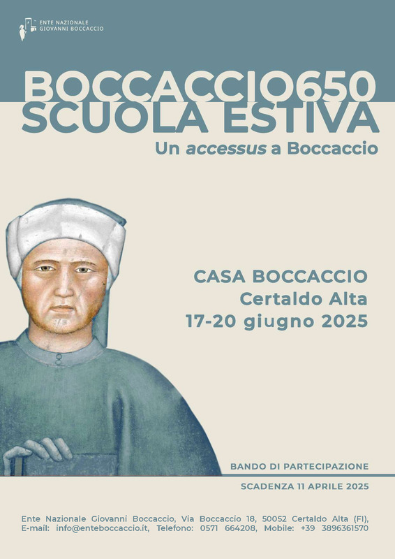 La Scuola estiva Un accessus a Boccaccio, nata nel 2019 e organizzata dall'ENGB in Casa Boccaccio, è rivolta a studiosi in formazione e dedicata all’opera di Giovanni Boccaccio, alla sua fortuna, agli strumenti critici per la sua interpretazione. Essa prevede lo scambio e l’acquisizione di metodi e problemi legati alla ricerca, in un ambito multidisciplinare di carattere letterario, filologico, linguistico, paleografico-codicologico, storico-artistico, in grado di offrire un’occasione di riflessione critica, di formazione metodologica, di aggiornamento storiografico.