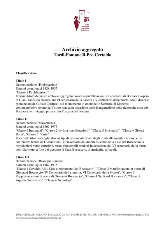 Nell’archivio Tordi - Fontanelli - Pro Certaldo sono raccolti tutti i documenti anteriori al 1958, cioè all’anno di fondazione dell’Ente Nazionale Giovanni Boccaccio. Qui si ritrovano lettere, inviti a manifestazioni, articoli di giornali, appunti e tutto ciò che è stato conservato dal cav. Domenico Tordi, e, in seguito, da Giuseppe Fontanelli, presidente dell’Associazione Pro Certaldo e primo conservatore di Casa Boccaccio, entrambi ferventi ammiratori dello scrittore certaldese.