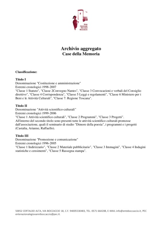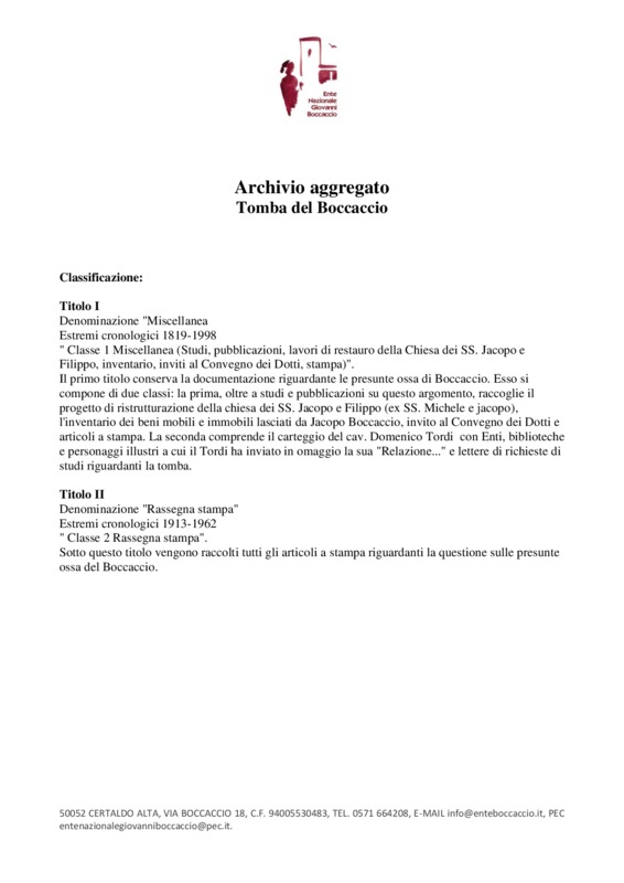 Dalla documentazione, presente in tale archivio, risalta subito che la parte più consistente è inerente alla rassegna stampa, con documenti relativi al V Centenario della nascita e al VI Centenario della morte di Boccaccio, al monumento eretto a Certaldo in tale occasione, a studi sulla figura dello Scrittore.