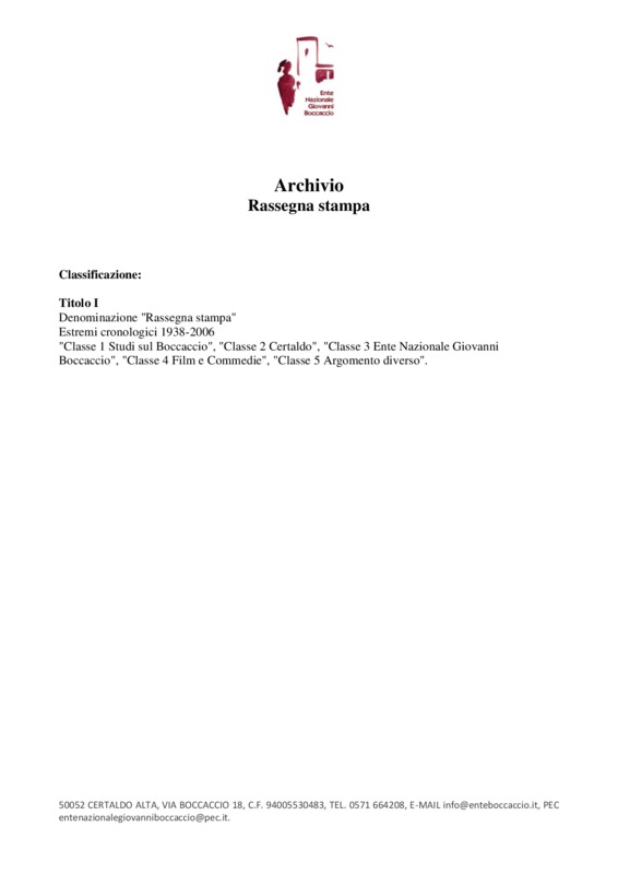 Cinque sottoserie costituiscono il corposo nucleo della rassegna stampa: articoli su Boccaccio e le sue opere; articoli su Certaldo e i suoi monumenti; articoli sull’Ente Nazionale Giovanni Boccaccio e manifestazioni; film e commedie tratte da opere del Boccaccio e articoli di argomento diverso. Gli articoli, tratti da varie testate giornalistiche, sono divisi in datati e non datati e sono ordinati in successione cronologica a partire dal 1959. Il primo gruppo comprende tutti gli articoli riguardanti il Boccaccio, gli studi fatti su di lui e le sue opere; il secondo tutti gli articoli sulla città di Certaldo e i suoi monumenti, compresi Casa del Boccaccio e il monumento al Poeta; si trovano qui tutti gli articoli riguardanti la Casa del Boccaccio, i lavori di ristrutturazione e gli articoli riguardanti la biblioteca ad essa annessa.